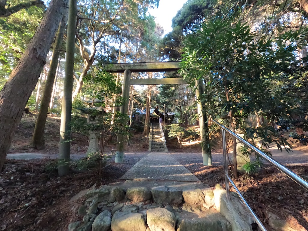 途中、二の鳥居が現れ、さらにその先に石段が続いています。鳥居と石段の間は神社関係者の方が使う車道が横切っています。