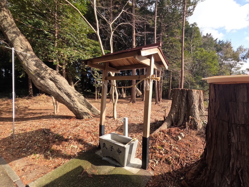 石段を登った先に小ぶりな銅板葺木造に本柱タイプの手水社が据えられていました。手水社周辺の切り株を見るとかなり太く、巨木だったことがわかります。