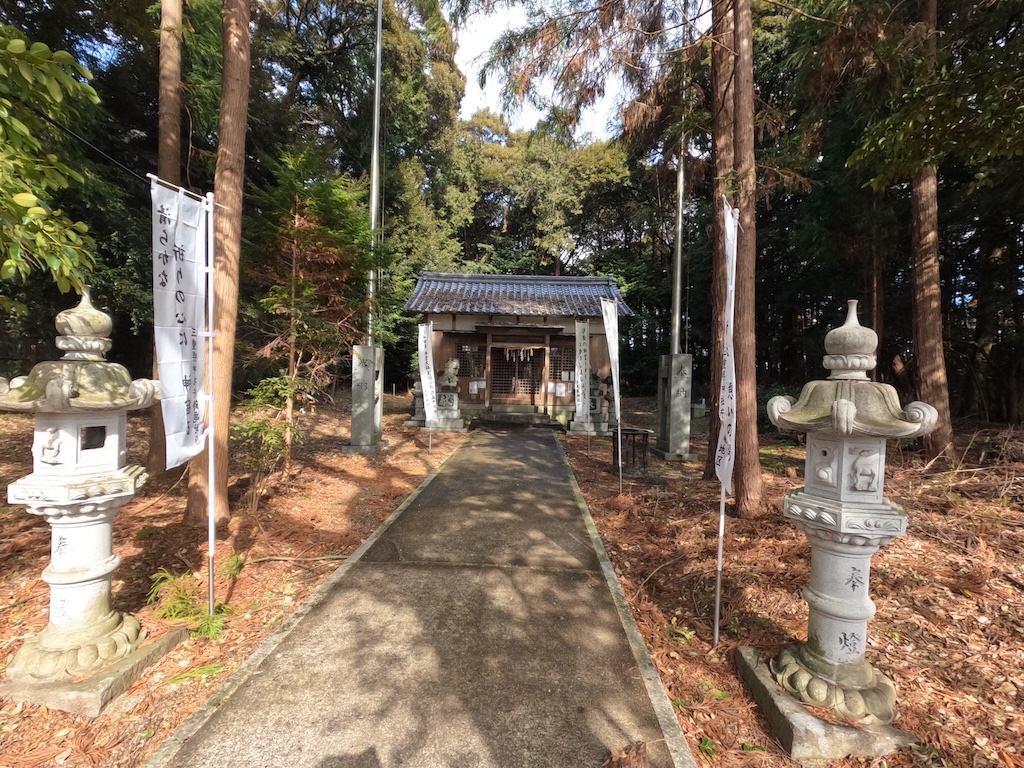 社殿に向かって参道が延びています。その両脇に灯籠と幟ポール併設型幟立石が据えられています。