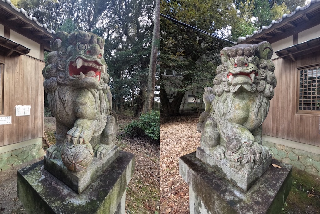 昭和後期から平成生まれと思われる狛犬一対になります。岡崎型狛犬の生産地である岡崎市に住んでいた自分にとってはこのお姿は非常に馴染みがあって見てると落ち着く感じです。