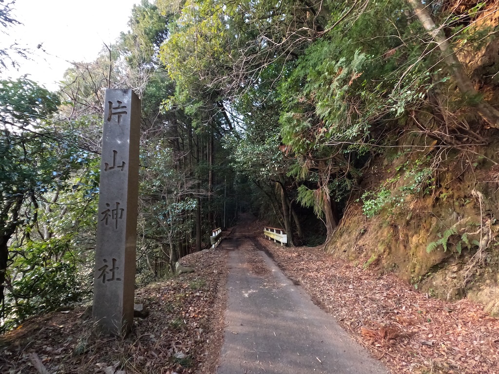 片山神社の正面の写真を撮影していた場所を振り向くとこんな感じ。右側から登ってきて、まさにUターンのような感じで左の道でさらに山を登っていきます。