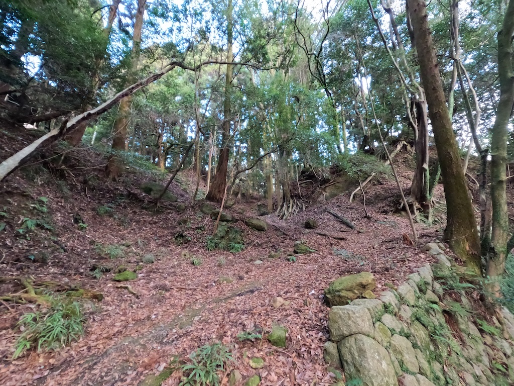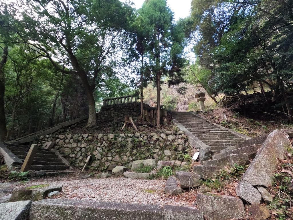 本殿を参拝した後、さらに石段を登っていきます。鉄道網、道路網が整備される前の鈴鹿峠を超える多くの旅人の参拝があった時代の片山神社の境内を見てみたいと思わせてくれるこの石段と石垣。そして何やら建物が建っていたであろう場所。こうして徐々に朽ちていっている所を見るにつれ鈴鹿峠周辺の過疎化も重なって氏子の形も減少しているであろうこの時代、神社の維持運営も大変なんだと思わずにはいられません。
