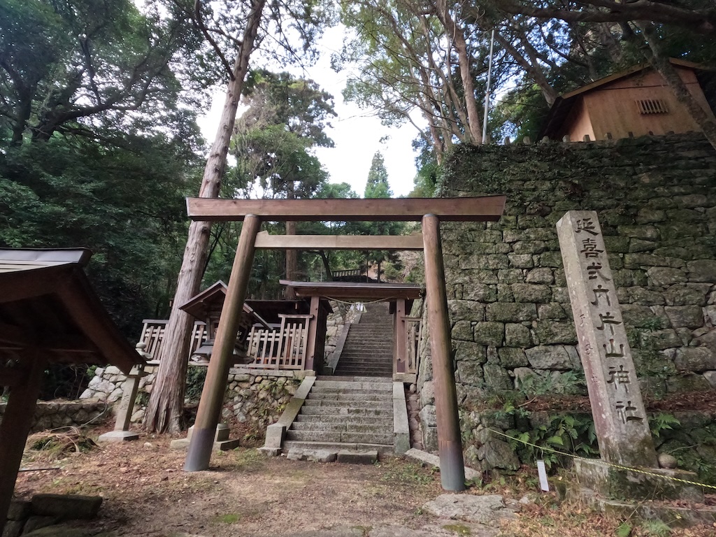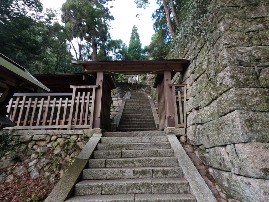 石段の参道の途中に神門がもうけられています。このアングルから神社だと想像する方は少数で大多数の方は城跡と思うのでは無いでしょうか。それくらい今まで参拝してきた神社の中でもかなり特異な神社になります。