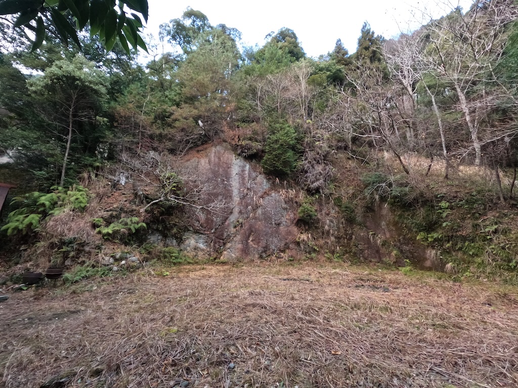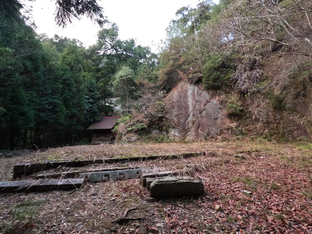 石段を登りきると、そこには本殿を含む社殿が鎮座していたであろう空間が広がっていました。社殿がどの方向に向いて鎮座していたのかは全く分からないのですが、中央に写っている岩肌とか何とも言えない雰囲気が漂っています。
