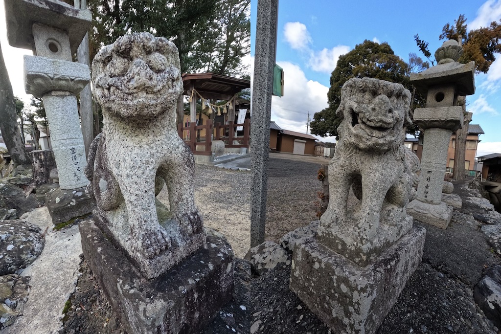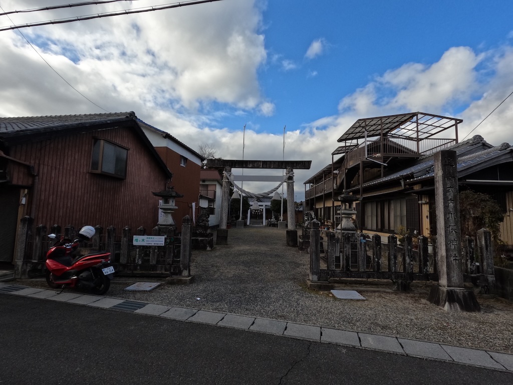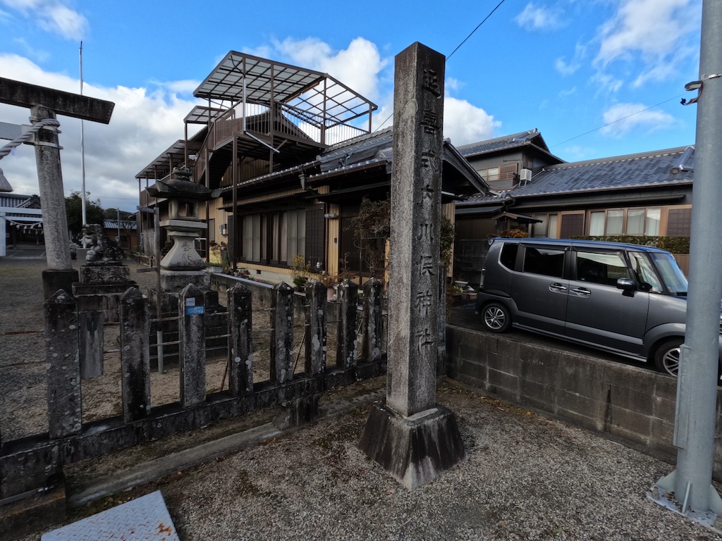 延喜式内が合わせて彫られた社号標と瑞垣が設けられ、その内側に石造灯籠一対、狛犬一対、神明鳥居が据えられた境内入口になります。前面に映っている道路部分は旧東海道になっていて、庄野宿のまさに鎮守の神として鎮座しているようです。