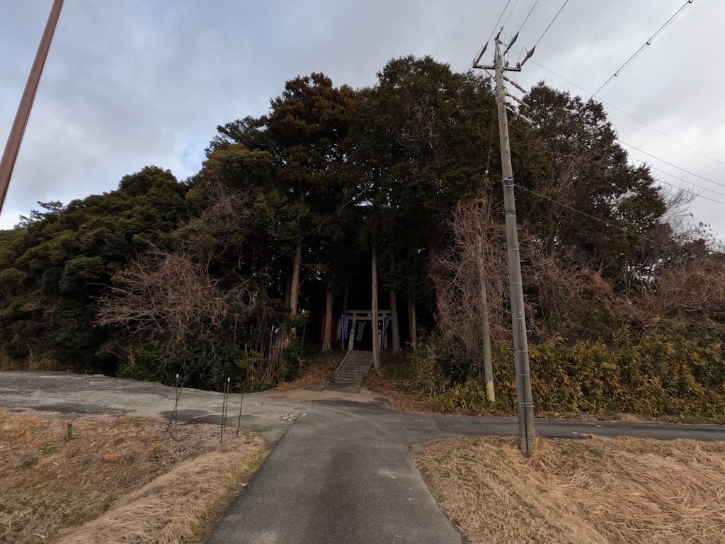 市道から境内に向かう参道が設けられています。一の鳥居とその奥に見える二の鳥居が立つ部分は一般道路(農道?)と共用されています。こんな感じの参道は田園地帯に鎮座する神社によく見かける洋式ですね。