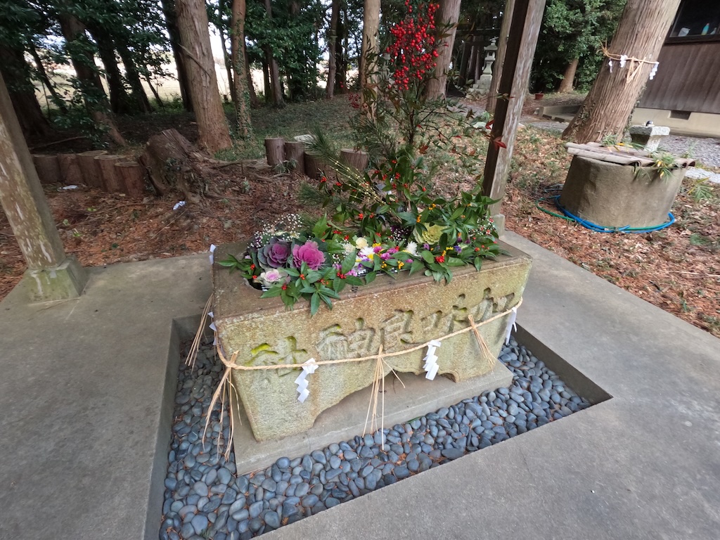 瓦葺木造四本柱タイプの手水社になります。三宅神社の手水社は花手水となっています。が、それよりも気になるのが・・