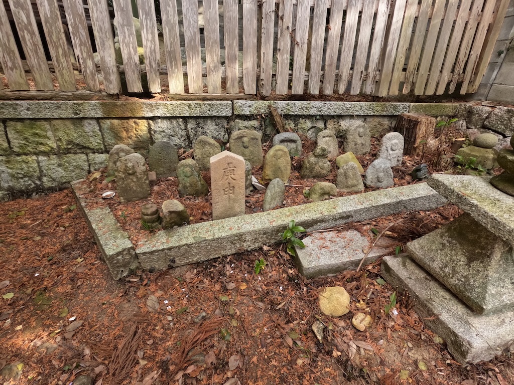 境内社の白龍社、稲荷社、子孫繁栄社、そして本殿わきに集められた石塔になります。