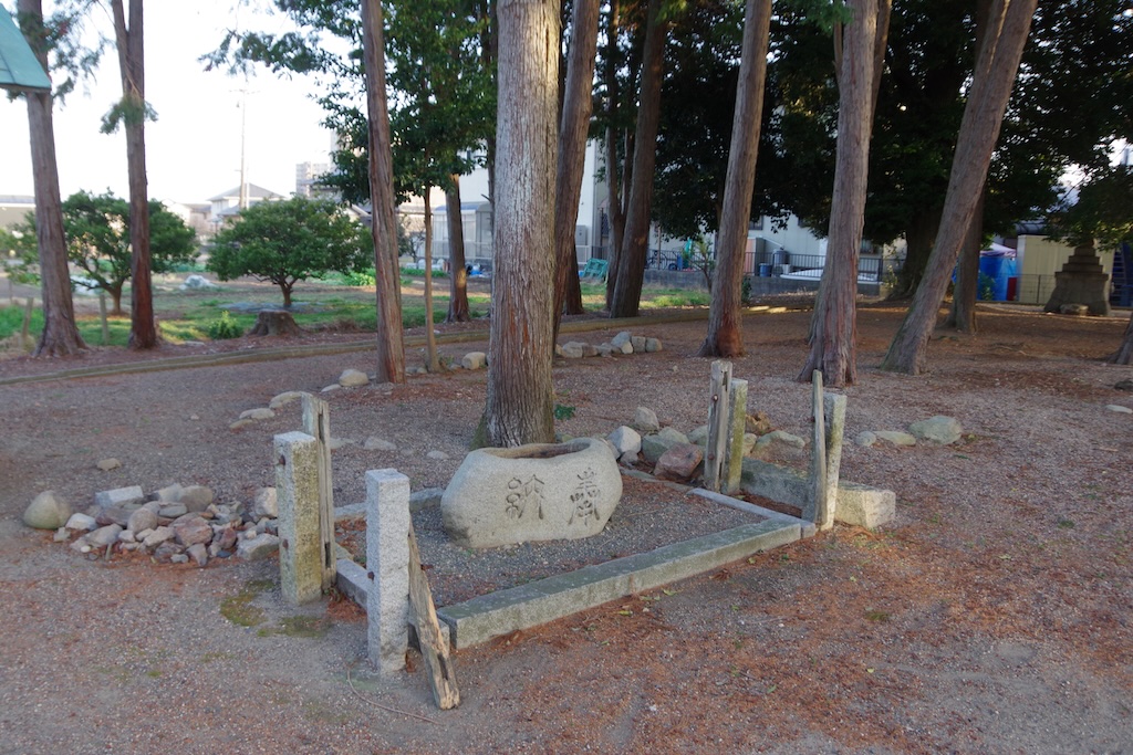 多分四本柱タイプの手水社があったんだろう跡が残っている水盤になります。