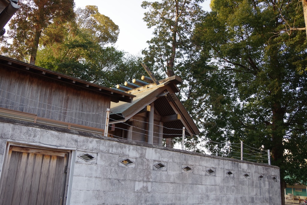 ブロック塀による瑞垣に囲まれた神明造の本殿になります。ブロック塀上の有刺鉄線が物々しい雰囲気を醸し出していますね。